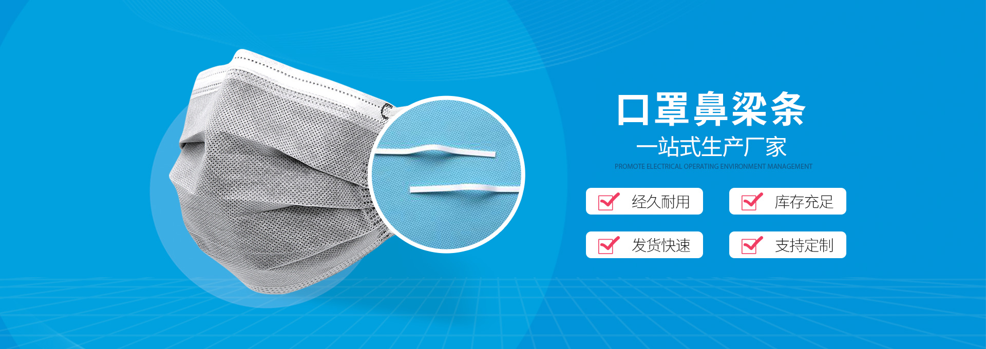 無(wú)錫辰安新材料是一家集研發(fā)、生產(chǎn)和銷(xiāo)售—體的現(xiàn)代化口罩物料鼻梁條、耳帶的企業(yè);公司地址位于全國(guó)創(chuàng)新型城市——江蘇省無(wú)錫市。產(chǎn)品多樣:有單芯鼻梁條、雙芯鼻梁條、全塑鼻梁條、鋁條鼻梁條、KN95、KN94口罩用鼻梁條可定制;口罩耳繩材質(zhì):氨綸、···